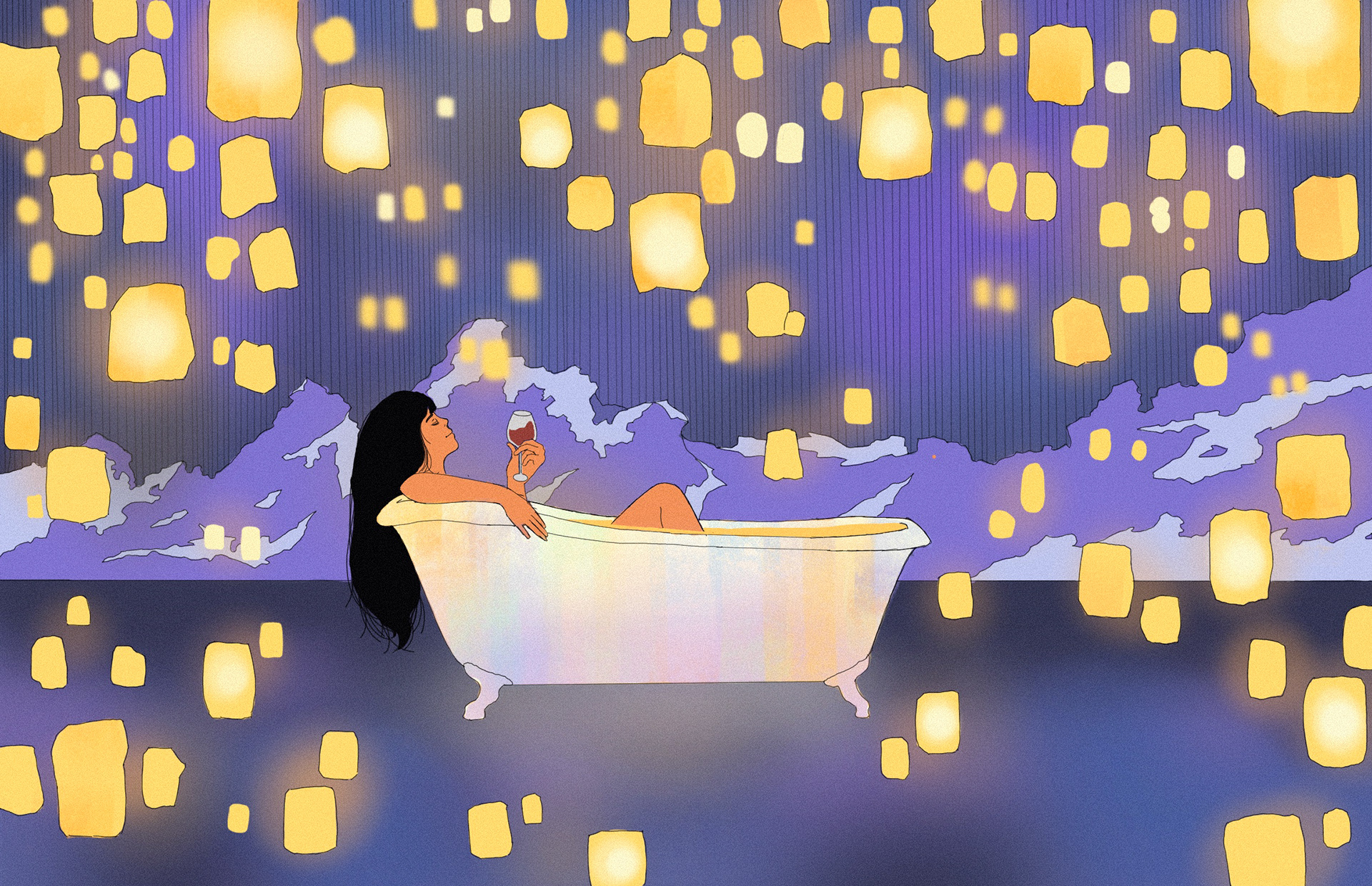 4/5 of Gentle Escapes. A collection of illustrations that features finding pleasure in everyday mundane and relatable activities. This illustration spotlights the rejuvenating feeling of taking a relaxing bath after a long day.