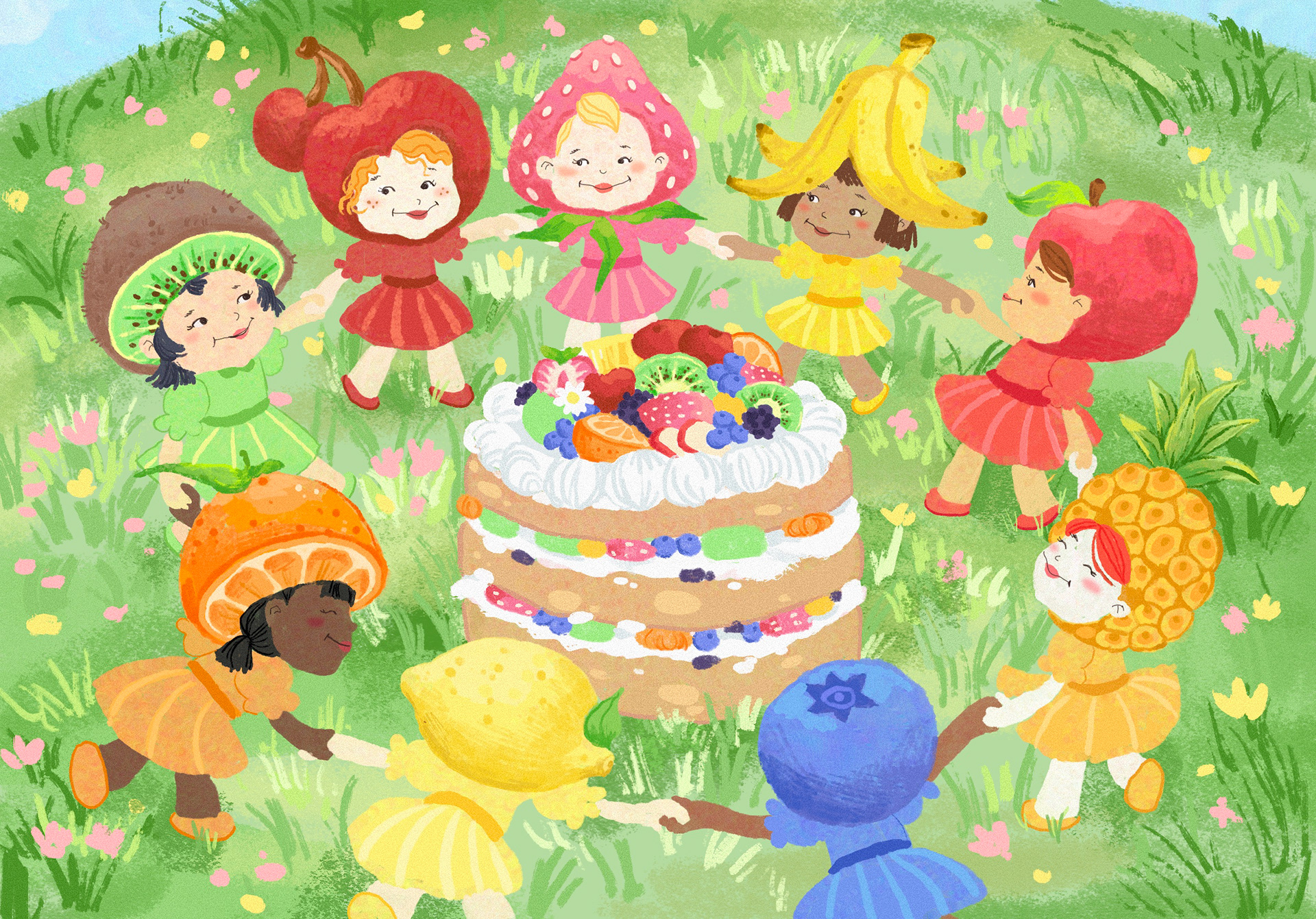 Group of little characters designed based on different types of fruit joining together to co-create a delicious fruit cake.